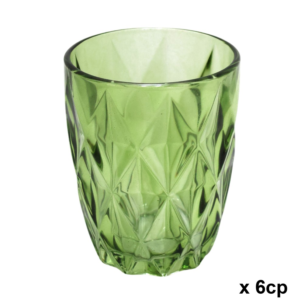 Six of six glasses of water made of glass in green. Each glass has 8x10 cm dimensions, bringing a warm and frustrated atmosphere to the taste of drink.