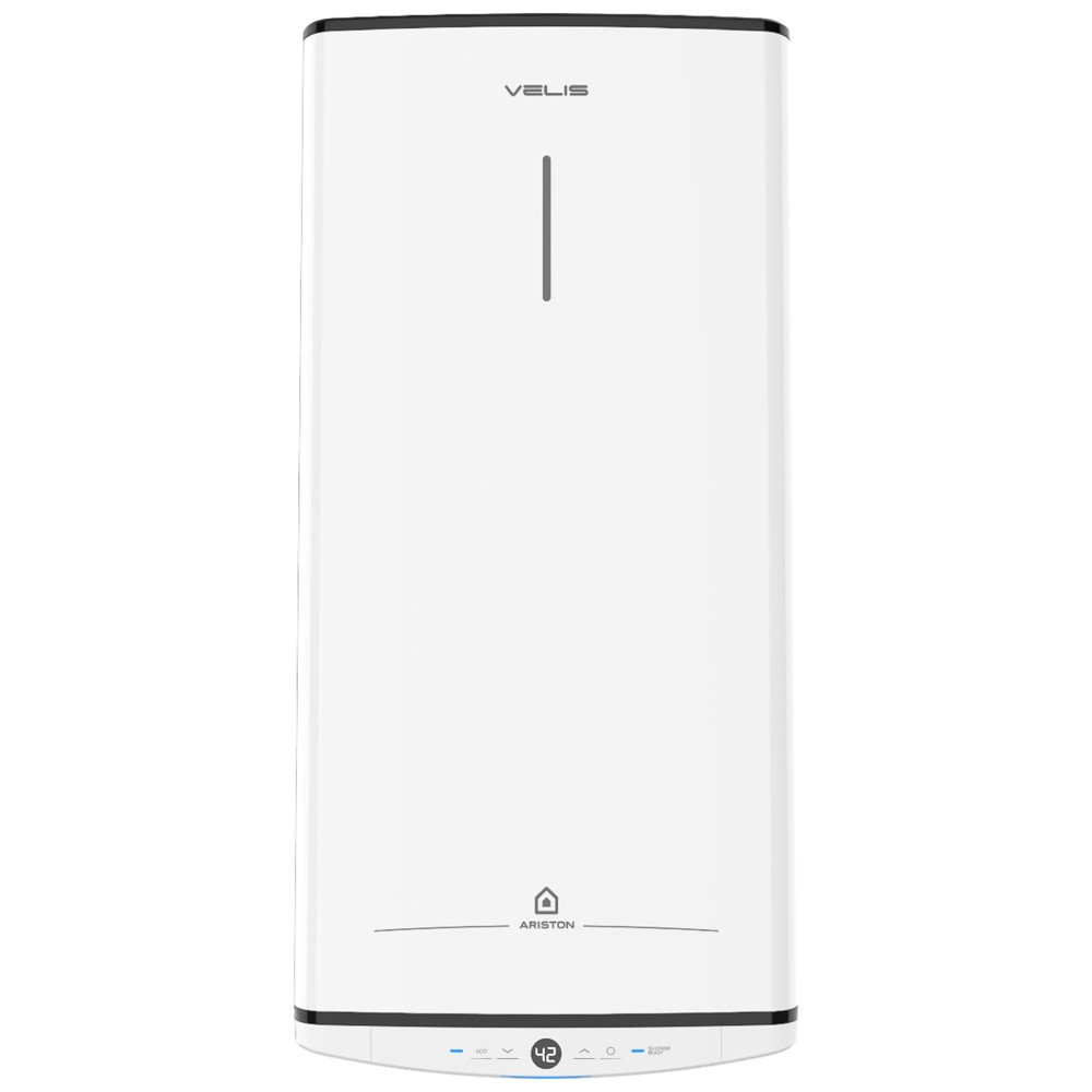 The ARISTON VELIS PRO 50 EU is Ariston’s latest electric water heater, offering an output of 50 liters and a maximum temperature of 80 °C. The first hot shower is ready in just 50 minutes! It operates at a maximum pressure of 8 bar and consumes 1.5 kW of power. With an IPX4 water resistance rating, this unit is ideal for installation in damp environments and provides flexible placement options in various conditions. Designed in Italy, this heater boasts a B energy efficiency rating, highlighting its functionality in reducing energy consumption. A standout feature is its Twin Tank Technology, which allows for up to 16% more hot water availability compared to traditional models. Its ultra-thin design, measuring just 27.5 cm in depth, makes it an ideal solution for installations where space is limited. The heater is equipped with smart features that enhance convenience and safety. It includes an innovative ECO EVO function that learns the user’s habits to better manage the use of the water heater and potentially reduce costs by up to 14%. The SHOWER READY alert notifies users when hot water is available, while additional safety measures, such as the anti-legionella function and ABS safety systems, provide extra protection. The Velis Pro model also features a titanium enamel coating that ensures excellent corrosion resistance, along with a larger magnesium anode for enhanced protection against corrosive elements. The device has a modern and stylish design, with clean lines and elegant finishes that create an aesthetically pleasing and versatile product. The LCD display at the bottom of the heater allows for easy monitoring of temperature and other settings.