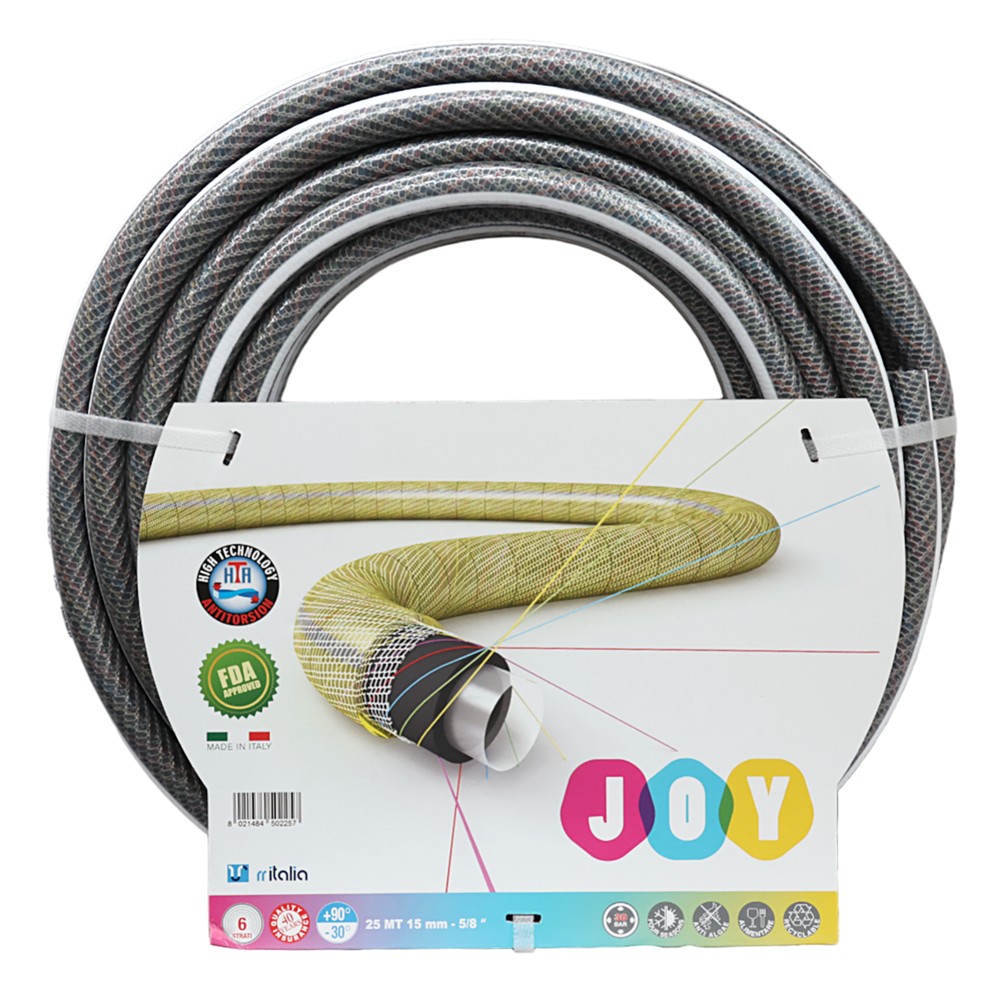 Flexible 6-ply irrigation pipe, 5/8" diameter, spiral braided and anti-twist reinforcement. Excellent flexibility even at very low temperature, against debris (algae) and has a long life. Polyester textile reinforcement braided to withstand 30 bar pressure. Its composition is a new refined rubber formula. Length 25m.