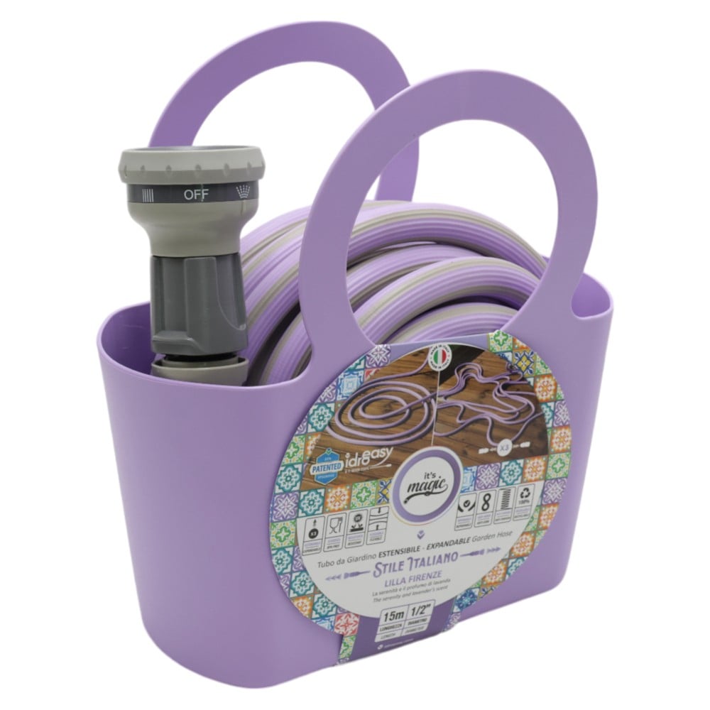 Constructed from lightweight 100% recyclable flexible plastic with maximum resistance to UV radiation and degradation over time. The 15 meter set of 1/2" diameter extension hose also comes in a package with its holder including the 15 m hose, two click connectors and the watering head. Its material makes this product resistant to twisting and guarantees extensibility up to 3 times the original tube length.
