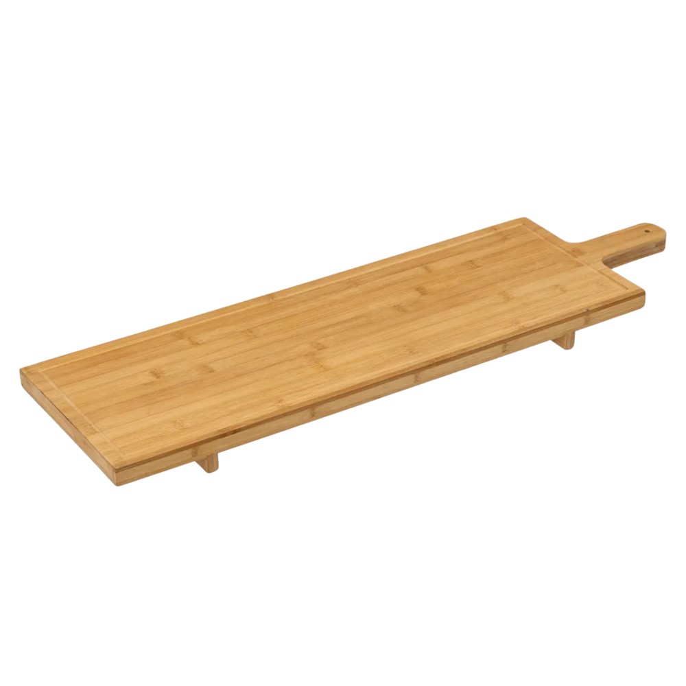 Wood cutter with legs, made of bamboo wood in beige color. It has a handle for easy transport. Ideal dish to serve appetizers or small cheeses in the middle of your table.