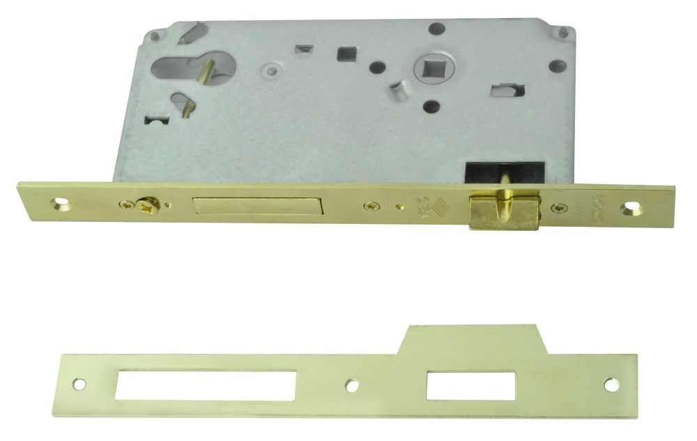Door locks with 50x85mm size, used for interior wood doors. Technical features: • Zinc painted steel case and cover • Brass plated removable faceplate and striker • Reversible brass conical latch • Double-throw steel dead-bolt single-throw dead-bolt for bathroom doors. • Roller can be adjusted from 2 to 13 mm.