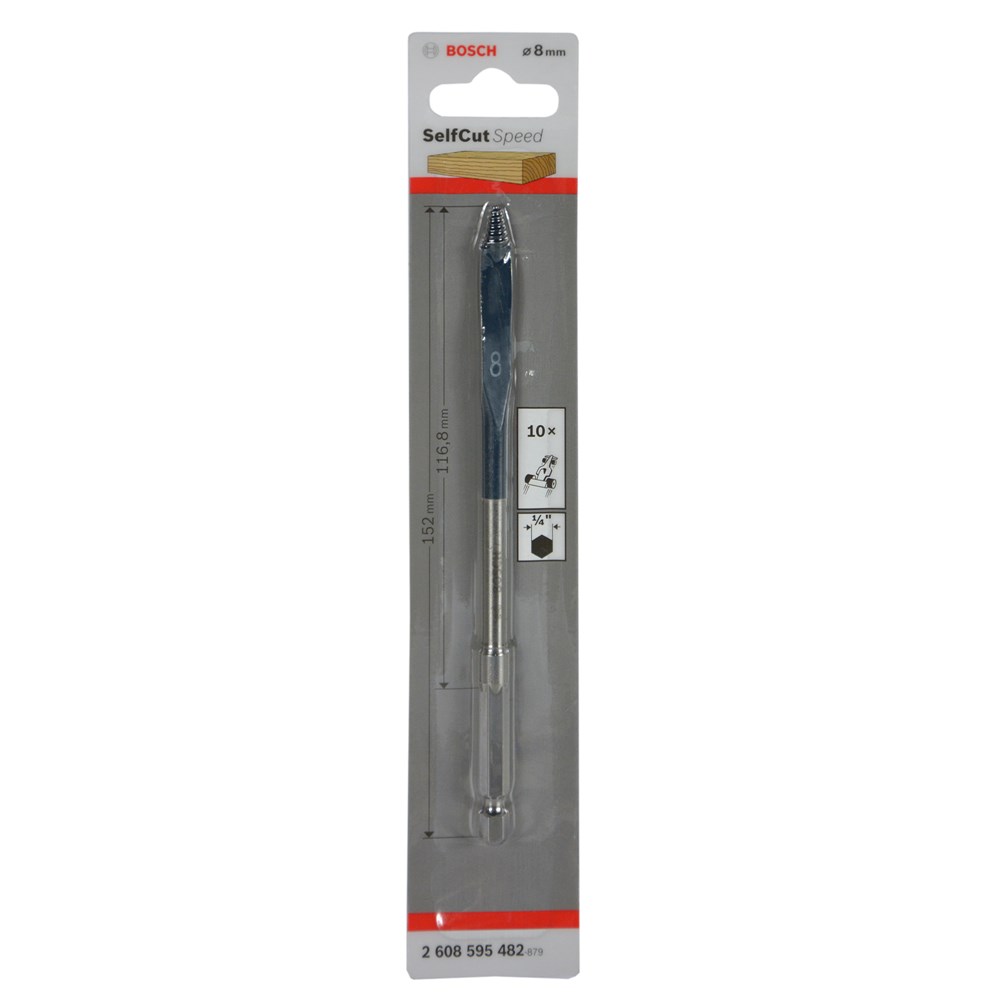 Suitable for soft and hard wood, light building material and plasterboard. Drills three times as fast as standard spade bits. Patent pending, self feeding threaded tip and cutting geometry. Manufactured in accordance with own factory standards from specially toughened steel. Precision ground tip and cutting edges for accurate dimensional stability when drilling. Shank with 1/4" hexagon socket manufactured to DIN 3126 - E 6.3. Innovative self-feeding threaded tip for fast and accurate drilling with little exertion of force