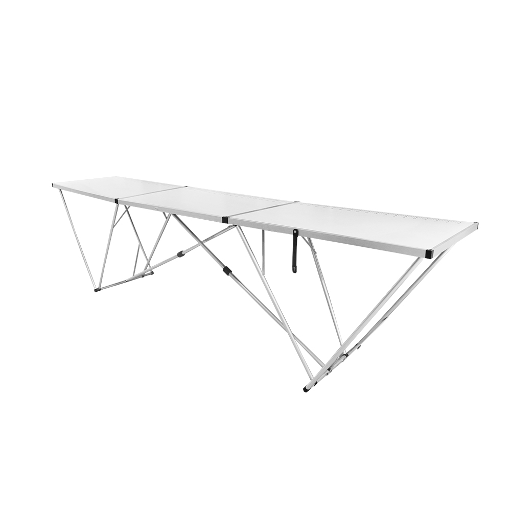 Aluminum trestle table. Robust quality. 5 mm thick, coated worktop with aluminum frame. Fixed connection of all components by Blindvernietung. Easy and quick assembling by dual bayonet lock.