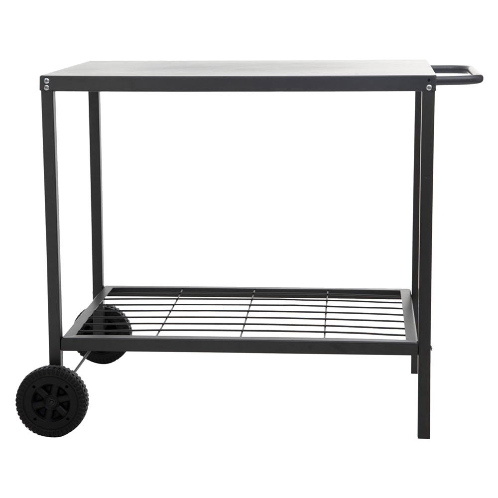 Banak tavolinë, në përmasë 90x58x75 cm, në ngjyrë të zezë, prej materiali metalik, me dorezë anësore dhe me 2 rrota për ta transportuar më lehtë nga një hapësirë në tjetrën. Përdoret si banak për gatime në ambjent te jashtëm, për të vendosur barbekju tavoline mbi të.