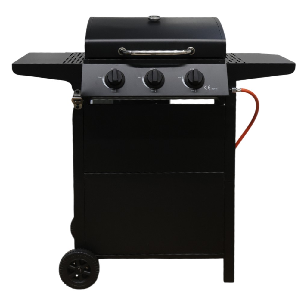 Kjo barbekju me gaz me 3 djegës është zgjidhja ideale për ata që duan të gatuajnë si profesionistë, me shpejtësi dhe komoditet maksimal. Dizajni i saj modern, prakticiteti dhe performanca e lartë e bëjnë perfekte për gatime në oborr, tarracë apo ambiente profesionale të hapura. Me tre djegës inox, secili me fuqi 2.8 kW (fuqi totale 8.4 kW), barbekju siguron shpërndarje të njëtrajtshme të nxehtësisë, duke garantuar pjekje të plotë dhe uniforme të mishit, perimeve apo peshkut. Ka sipërfaqe gatimi 51.5x33.5 cm me grilë çeliku të emaluar që ruan nxehtësinë dhe nuk ngjit ushqimin. Gjithashtu, rafti ngrohës inox e mban ushqimin të ngrohtë deri në servirje.Prej material çeliku me veshje rezistente ndaj temperaturave të larta, duke garantuar jetëgjatësi edhe në përdorim intensiv. Termometri inox i integruar ju mundëson të kontrolloni temperaturën në çdo moment pa hapur kapakun. Sistemi i ndezjes është automatik “push and turn”, për ndezje të menjëhershme dhe të sigurt. Ka tabaka vaji galvanizuar që hiqet lehtë nga pjesa e pasme për një pastrim të shpejtë dhe higjienik. Ka dy tavolina anësore me nga 3 varëse secila, të përshtatshme për veglat e barbekjusë. Poshtë ka rafte metalike për organizimin e aksesorëve dhe përbërësve. Pajisur me dy rrota plastike për lëvizje të lehtë dhe të shpejtë.