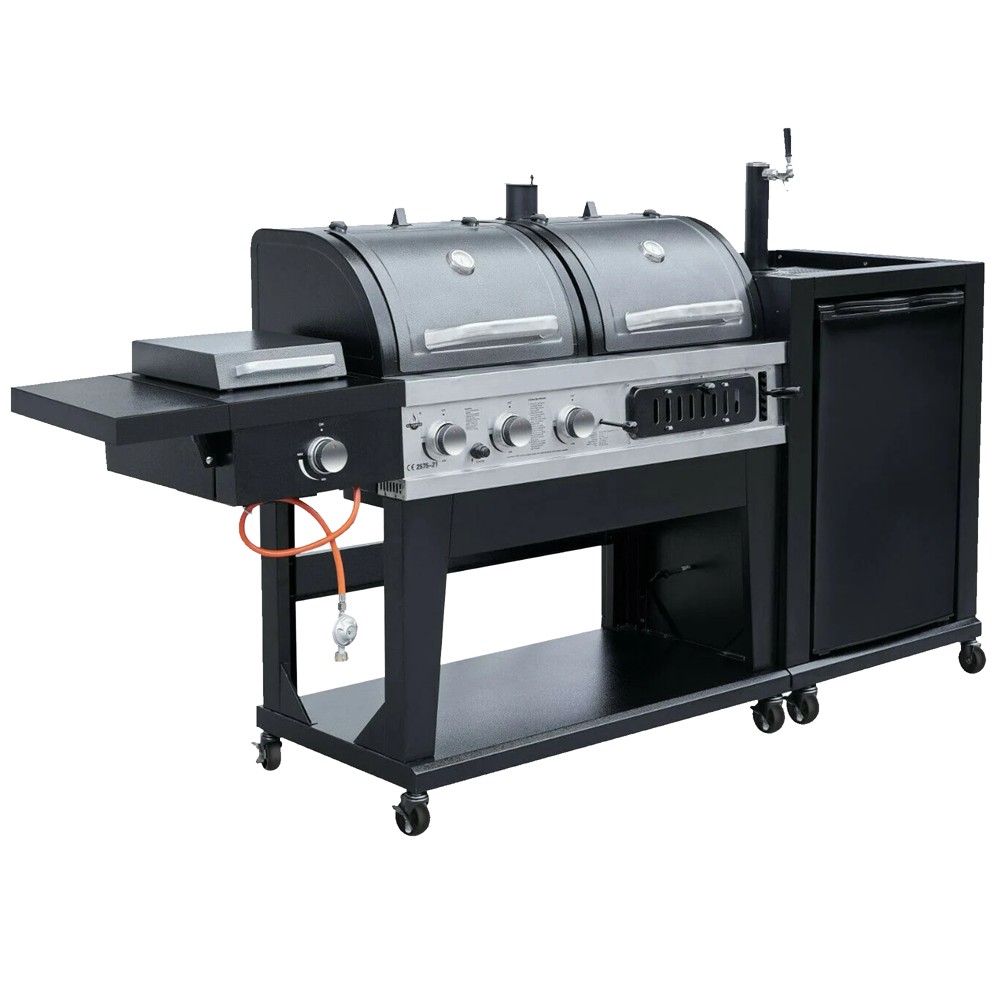 Me këtë barbecue te kombinuar ju jeni të përgatitur mirë për çdo rast dhe çdo kërkesë. Falë funksionalitetit të trefishtë, ju mund të zgjidhni përgatitjen optimale për çdo pjatë dhe metodën e kërkuar të gatimit. Sidomos në festimet e mëdha, kjo barbecue shkëlqen me ftohësin dhe shperndaresin e integruar të birrës. Ju mund të ruani dhe ftohni fuçitë e birrës lehtësisht dhe të sigurt dhe të shërbeni me lehtësi birrë nga fucia - edhe gjatë pjekjes. Kur përdorni skarën e gazit do të keni disa avantazhe kryesore: komoditet dhe përdorshmëri. Për shembull, gatimi i ushqimit mund të fillojë brenda pak minutash. Ka tre ndezës të fuqishëm, secila me 2,93 kW, në mënyrë që edhe projektet kërkuese të mund të zotërohen lehtësisht. Opsionet e ndryshme të vendosjes së kësaj skare ju lejojnë të gatuani çdo ushqim në mënyrë optimale - për një dietë të pasur dhe të shëndetshme! Pjekja në skarë me qymyr i jep ushqimit tuaj aromën klasike të tymit dhe një kore të fortë - një kënaqësi e vërtetë! Mekanizmi inovativ i levës, me të cilin mund të rregulloni lartësinë e enes me qymyr në 6 hapa/ nivele, në vend që t'ju duhet të trajtoni me mundim grilën e nxehtë të skarës, ju lehtëson ndjeshëm punën dhe ju garanton shumë më tepër argëtim në pjekje! Furnizimi me ajër mund të rregullohet nëpërmjet dy mbulesave ajri (1x në pjesën e përparme, 1x anesore), të cilat kontrollohen lehtësisht nëpërmjet levave të veçanta në pjesën e përparme. Barbecuete me gaz dhe qymyr janë të pajisura me grila të trashë prej gize, të cilat në mënyrë