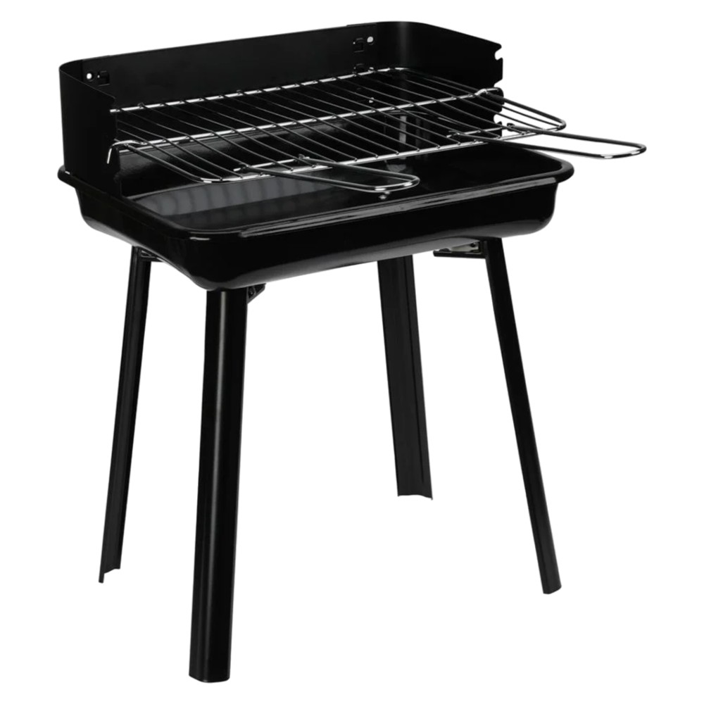 Barbekju portative me qymyr, prej materiali metalik, në formë drejtkëndore, e pajisur me 4 këmbë, me 3 nivele, për vendosjen e skarës të gatimit, ushqimeve dhe aksesorëve të tjerë. Përdoret për pjekjen e mishit, perimeve, peshkut, etj. Ky produkt është praktik në përdorim, pastrohet lehtësisht dhe është i përshtatshëm për udhëtime, kamping apo piknik, falë këmbëve të cilat mund të hiqen për të mos zënë hapësirë.