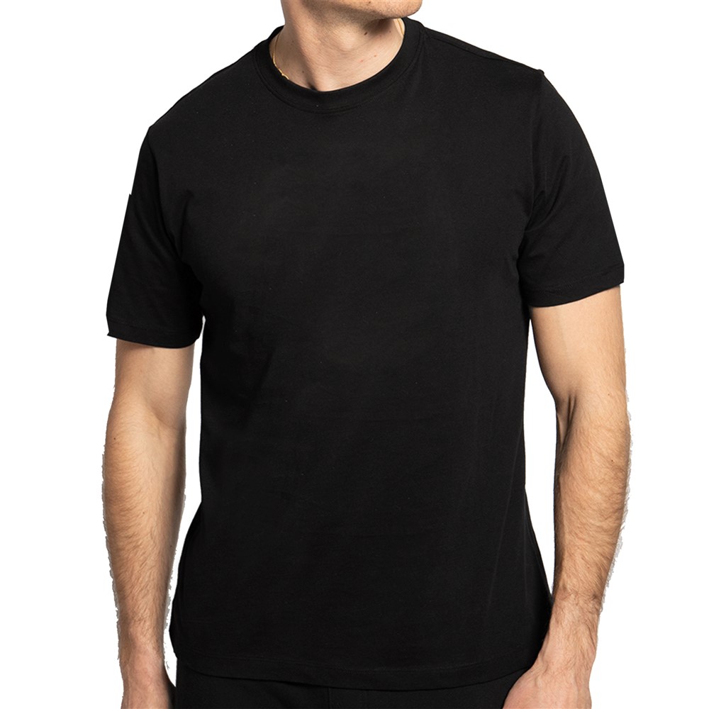 Bluzë me mëngë të shkurtra për meshkuj, prej materiali pambuku të butë, me veti anti-alergjike dhe antibakteriale, në ngjyrë të zezë. Materiali përbërës nuk shkakton irritim në lëkurë, është higjienik, lejon ajrosjen e lëkurës dhe përthith lagështinë e tepërt. Ky produkt është i përshtatshëm për përdorim të përditshëm.
