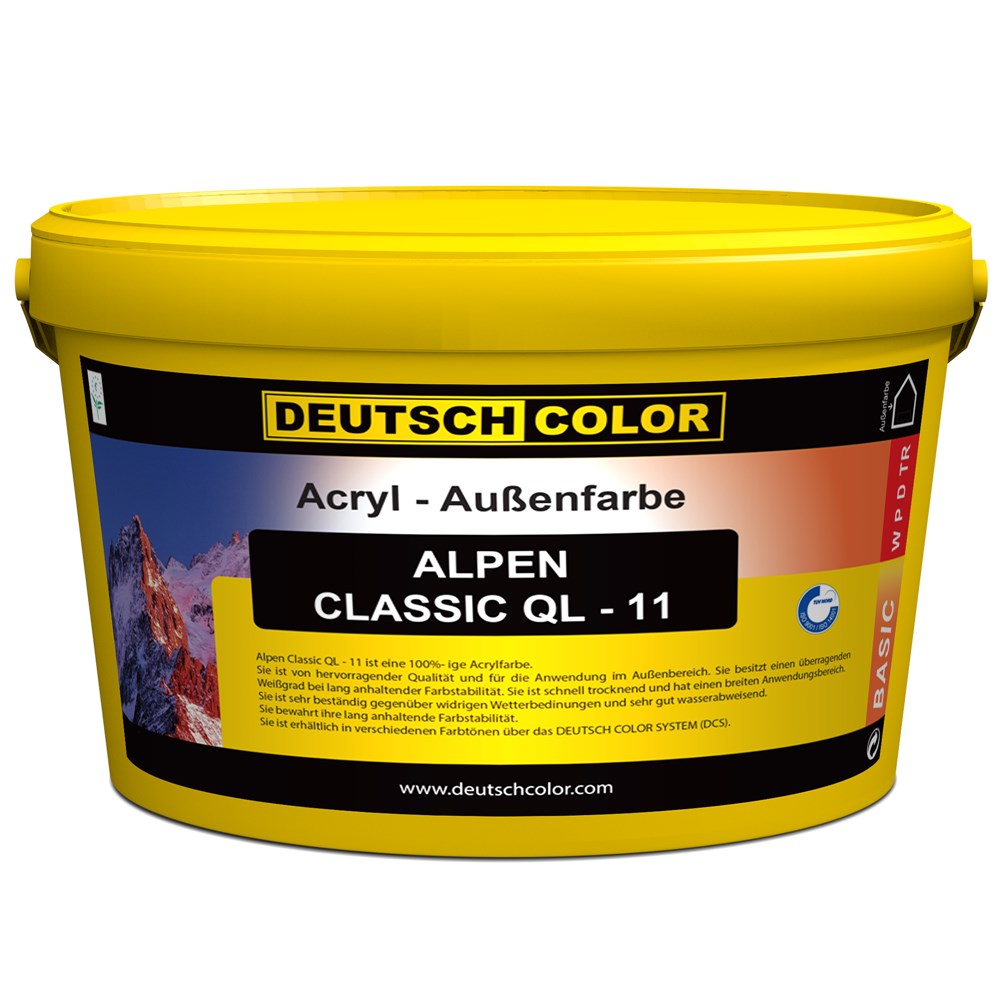 Alpen Classic QL 11 është bojë akrilike me cilësi të shkëlqyera për përdorim të jashtëm. Zotëron punueshmëri dhe aftësi niveluese shumë të mira, ngjitje të fortë dhe tharje të shpejtë.Pas aplikimit, rezultati është një rifiniturë mat me rezistencë tepër të mirë ndaj ujit dhe agjentëve të ndryshëm atmosferikë.