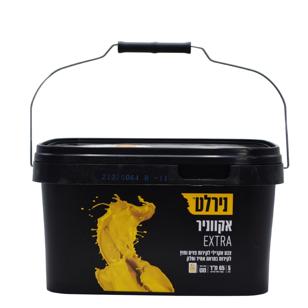 Bojë akrilike Aquanir, e bardhë, 5 Lt, Baza B. Bojë elastike akrilike me një mbulim të jashtzakonshëm, e përdorshme për brenda dhe jashtë. Mbas lyerjes përftohet një shtresë kadife e butë, e cila i jep murit të shtëpisë një pamje të këndshme, të qetë dhe elegante. E qëndrueshme në kohë dhe e ruan pamjen. NIROCRYL mbart shenjën e standarteve Izrael 1945. Përdorimi tipik: për lyerjen e brendshme dhe të jashtme të mureve. Parapërgatitja e sipërfaqes: pastroni sipërfaqen mirë nga papastërtitë si: gëlqere, pluhur, shtresa lyerje të mëparshme apo graso para se të filloni lyerjen. Sigurohuni që lyerja e mëparshme është e ngjitur mirë pas murit. Hiqini cipat e murit mirë me një mistri dhe një letërzmerile. Pastrimi: veglat dhe duart duhet të pastrohen me ujë dhe sapun menjëherë pas përdorimit. Karakteristikat e shtresës së lyerjes: nuanca e ngjyrimit: e bardhë plus 1500 nuanca nga katalogu i këndshëm NIRLAT. Niveli i shkëlqimit: mat. Të dhënat materiale: përzjerie akrilike e bazuar në ujë dhe substanca minerale. Tretja: me ujë deri në 20% për shtresën e parë. 10% për shtresën e dytë. Aftësia e mbulimit: 16 m2 për litër në dy shtresa. Viskoziteti: 98KU ± 10%. Aftësia e mbulimit është e llogaritur sipas matjes së punës të një punëtori me përvojë dhe me aftësi, me një gradë të ndryshme përvetësimi dhe mund të ndryshojë në varësi të metodës së punimit, sipërfaqes dhe kushteve klimaterike. Kufizimet: mos e aplikoni bojën kur temperatura është nën 7° C ose kur parashikohet shi. Kohëzgjatja e tharjes. Për rilyerje: 2 orë (në kushte normale të motit). Për ta prekur: 1 orë. Tharja e plotë: 24 orë.