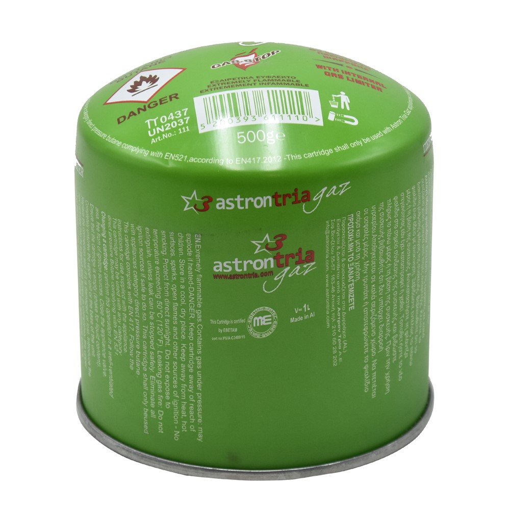 Bombel gazi Astron tria, prej materiali metail, 500 gr, me sigurues. Bombula ne pjese e siperme te saj eshte me sigurues. E lehte ne perdorim dhe e pershtatshme per tu perdorur ne pajisjet e cdo lloj petrogazi 500 gr.