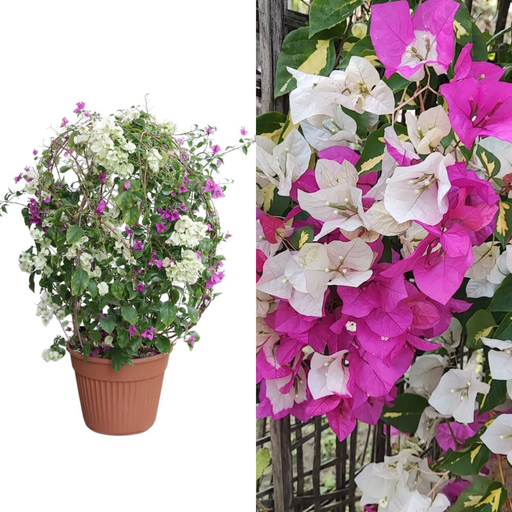 Bougainvillea është një bimë me gjelbërim të përhershëm që bie në sy dhe me ngjyra spektakolare. Pjesa e poshtme vjen në një gamë të madhe ngjyrash, duke përfshirë vjollcën, vjollcën, rozën, kajsinë, të kuqe, të verdhë dhe të bardhë. Ato janë në fakt bracts të mëdha të holla letre që rrethojnë një grup qendror lulesh të vërteta, të cilat janë me ngjyrë të vogël dhe të bardhë. Kushtet e rritjes pa ngrica janë thelbësore për bougainvillea. Ata mund të prodhojnë lulëzim të përsëritur për shumë muaj nëse kushtet janë të përshtatshme. Bougainvilleat shpesh shiten si bimë shtëpie, zakonisht të trajnuara rreth një rrethi teli ose në një kornizë, por ato gjithashtu mund të rriten si shkurre, lart në mur ose mbi një hark. Nga natyra, ata kanë nevojë për shumë hapësirë për t'u rritur dhe mund të arrijnë lehtësisht dy metra lartësi. Varietetet kompakte të bougainvillea janë në dispozicion, ato rriten deri në një metër të lartë dhe funksionojnë mirë si shkurre ose mund të mbillen edhe në një shportë të varur.