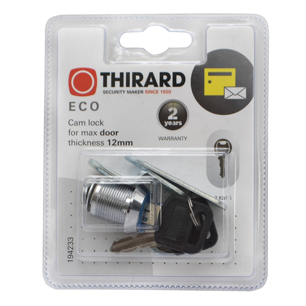 Moulded alloy body. Disc tumblers mechanism. Flat cam. 2 nickel plated keys with head protector by a PVC shell. Nut and fixing click.