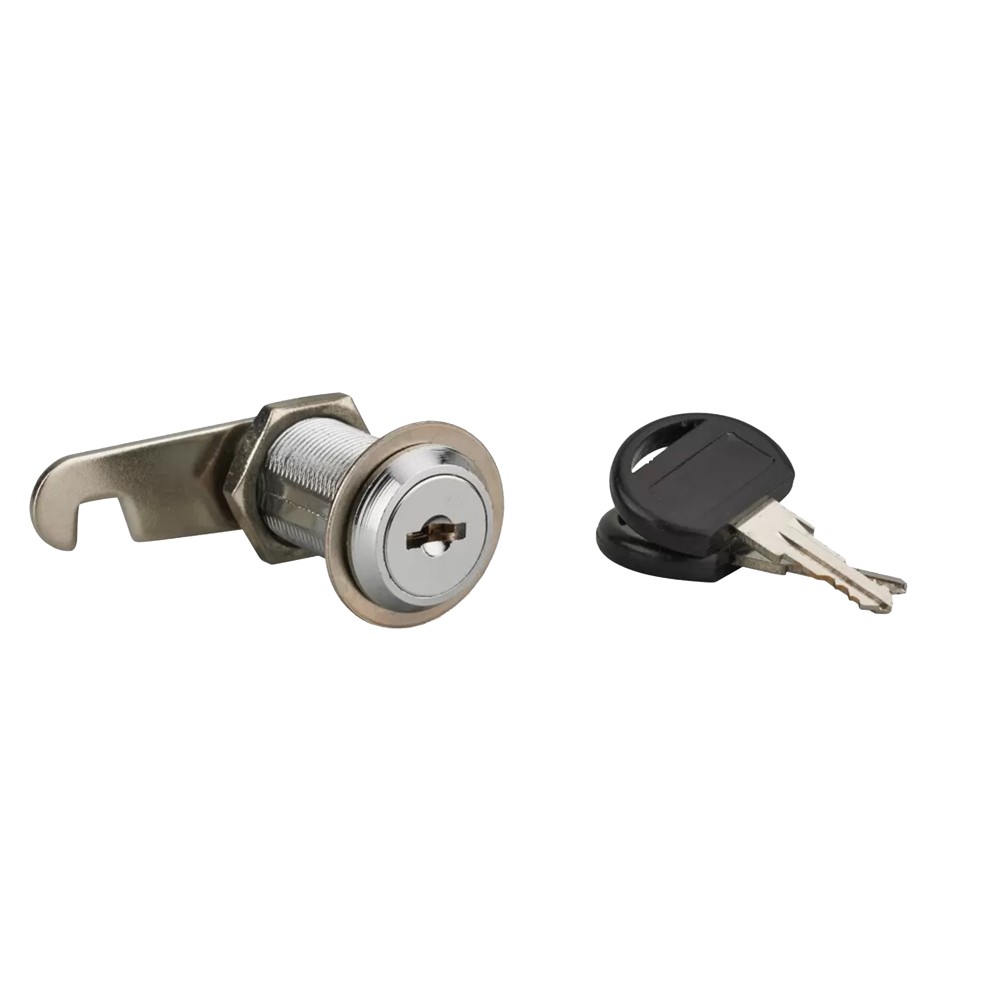 Moulded alloy body. Disc tumblers mechanism. Flat cam. 2 nickel plated keys with head protector by a PVC shell. Nut and fixing click.