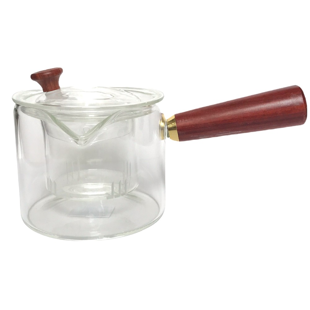 Çajniku me filtrues dhe dorezë, i përbërë nga qelqi për çajnikun dhe dru për dorezën, është transparent dhe ka një lartësi prej 9 cm, me një kapacitet prej 600 ml. Ky çajnik ofron një zgjedhje të shkëlqyer për të përgatitur dhe shërbyer çajin në një mënyrë të thjeshtë dhe të lehtë. Materialet e qelqit dhe doreza e drurit i japin një ndjesi natyrale dhe të pastër për përdoruesin. Dizajni transparent i qelqit e bën të lehtë për të parë nivelin e lëngut brenda çajnikut. Doreza e drurit siguron që përdorimi i çajnikut të jetë komod dhe të sigurt.
