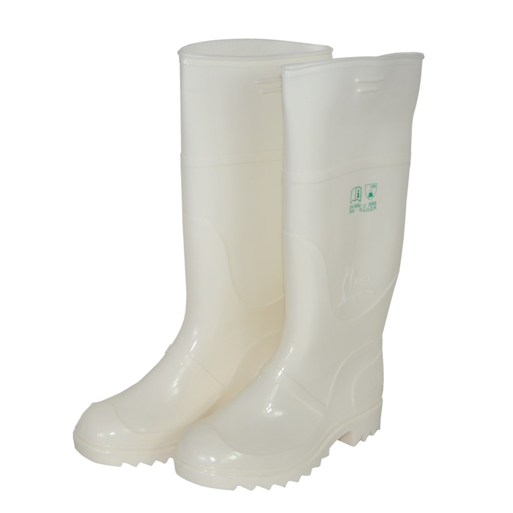 Çizme plastike, të bardha për industrinë ushqimore. Materiali PVC dhe Nr.41. Prodhuar nga një material shumë cilësor dhe i virgjër prej PVC- je. Këto çizme mund të përdoren në vende me vajra, yndyrëra apo tretësira të tjera duke ju mbrojtur nga rrëshqitjet apo dëmtimet e mundshme në ambientet tuaja të punës.