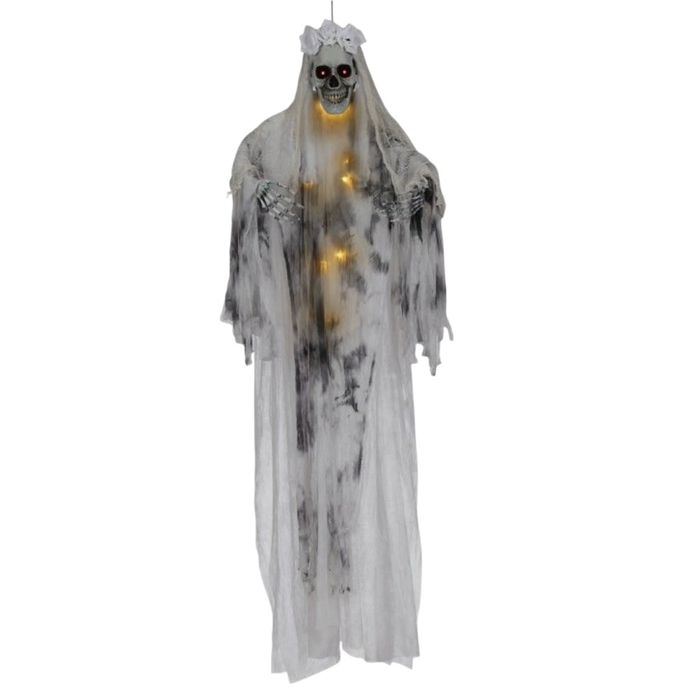 Ky dekorues Halloween me dizajn nuse është perfekt për të krijuar një atmosferë misterioze. Me një gjatësi prej 180 cm, ai vjen i pajisur me drita, duke shtuar një efekt të veçantë dhe argëtues. I bërë nga materiale të qëndrueshme, ky dekorim është ideal për t'u varur në dyer, mure ose tavane, duke tërhequr vëmendjen e të gjithëve.