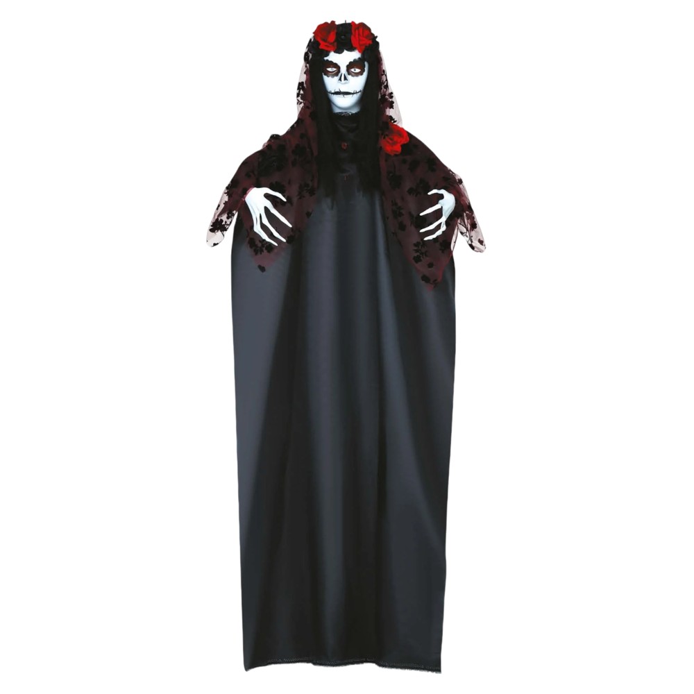 Ky dekorues Halloween me dizajn kukulle Catrina është një aksesor unik për festën tuaj. Me një gjatësi prej 155 cm, ai vjen me drita, duke krijuar një atmosferë magjike dhe misterioze. E bërë nga materiale të qëndrueshme, kjo kukull është ideale për t'u varur në dyer, mure ose tavane, duke tërhequr vëmendjen e të gjithëve.