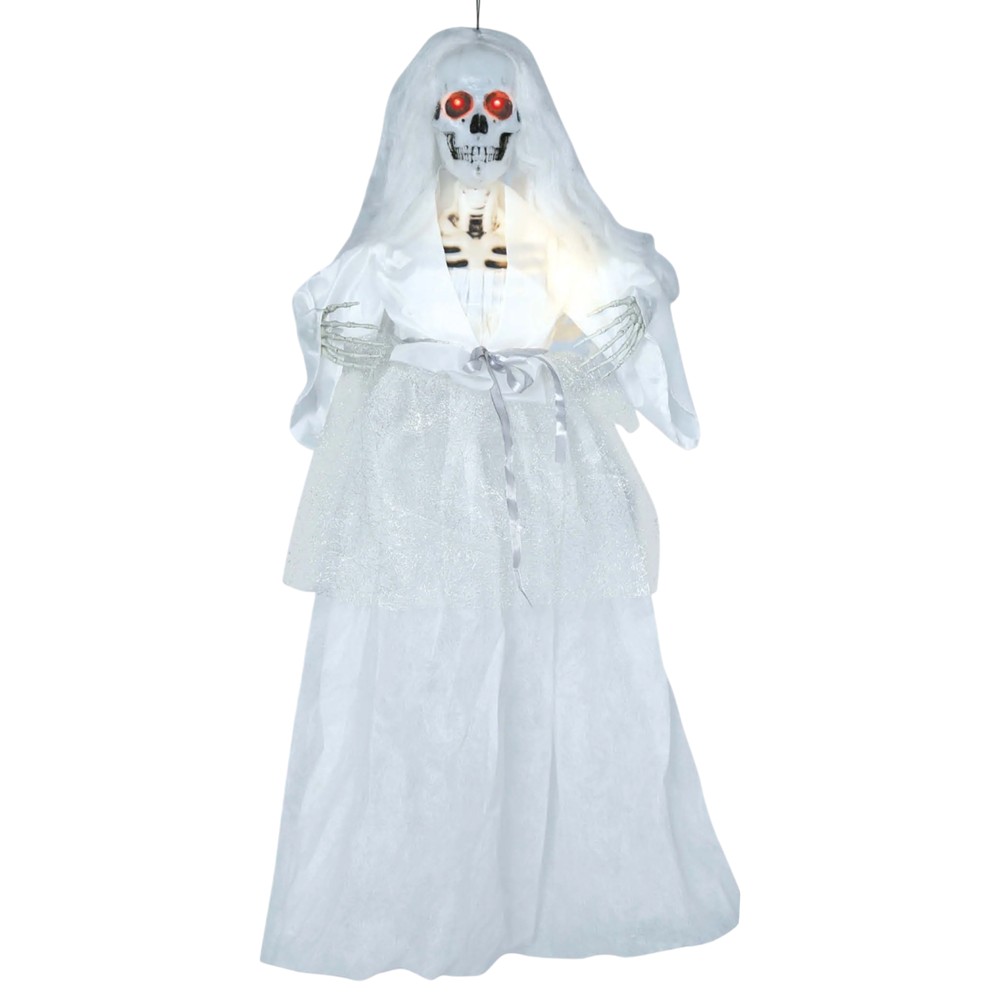 Ky dekorues Halloween i dizajnuar si një nuse skeleti është perfekt për të shtuar një atmosferë të frikshme në festën tuaj. Me një gjatësi prej 90 cm, ai vjen me drita dhe zë, duke e bërë atë të duket edhe më impresionues. I përshtatshëm për t’u varur në dyer, mure ose tavane, ky dekorim do të tërheqë vëmendjen e të gjithëve dhe do t’i japë një prekje të veçantë dekorit tuaj për Halloween.
