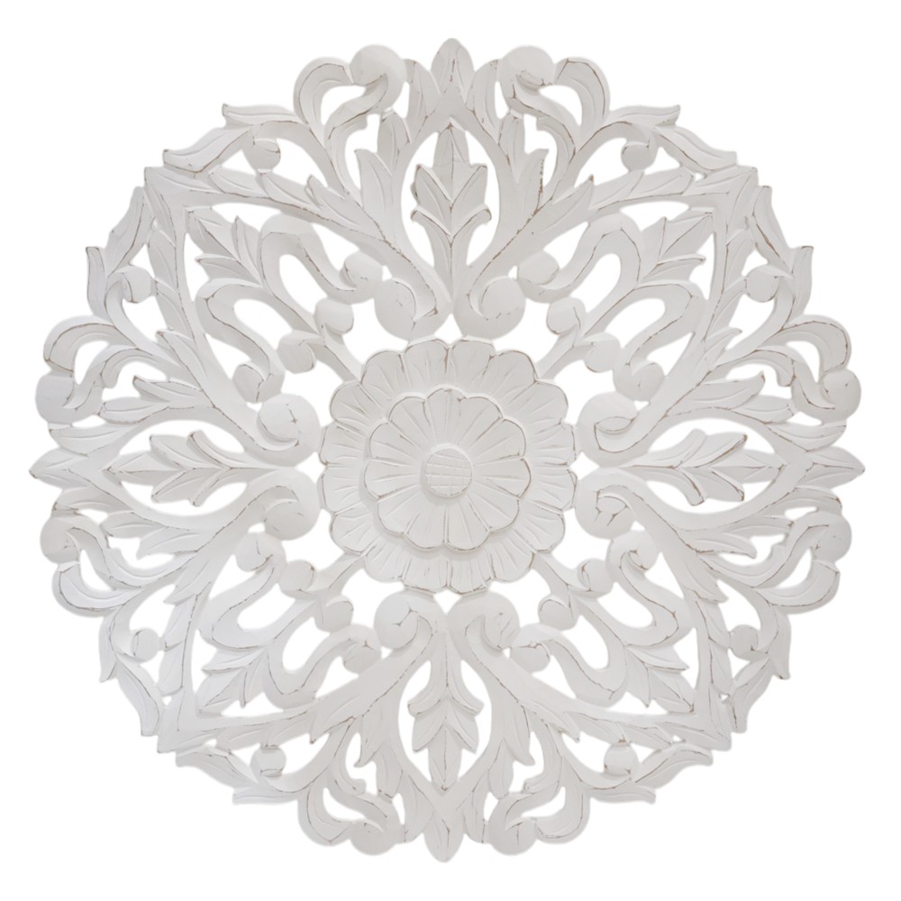 Ky dekorues muri i drurit, me dimensionet Ø90 cm, sjell një prekje të veçantë dhe estetike në ambiente. Krijimi i tij nga druri me ngjyrë të bardhë i jep një ndjesi të pastër dhe të freskët, duke e bërë atë një zgjedhje të shkëlqyer për të zbukuruar muret në shtëpi, zyra, ose ambiente të tjera. Me stilin e tij të thjeshtë dhe të modernizuar, ky dekorues muri është lehtësisht përputhshëm me shumicën e dekorimeve të brendshme. Ai është ideal për të shtuar një përzierje të shkëlqyer të stilizimeve moderne dhe tradicionale në ambiente.