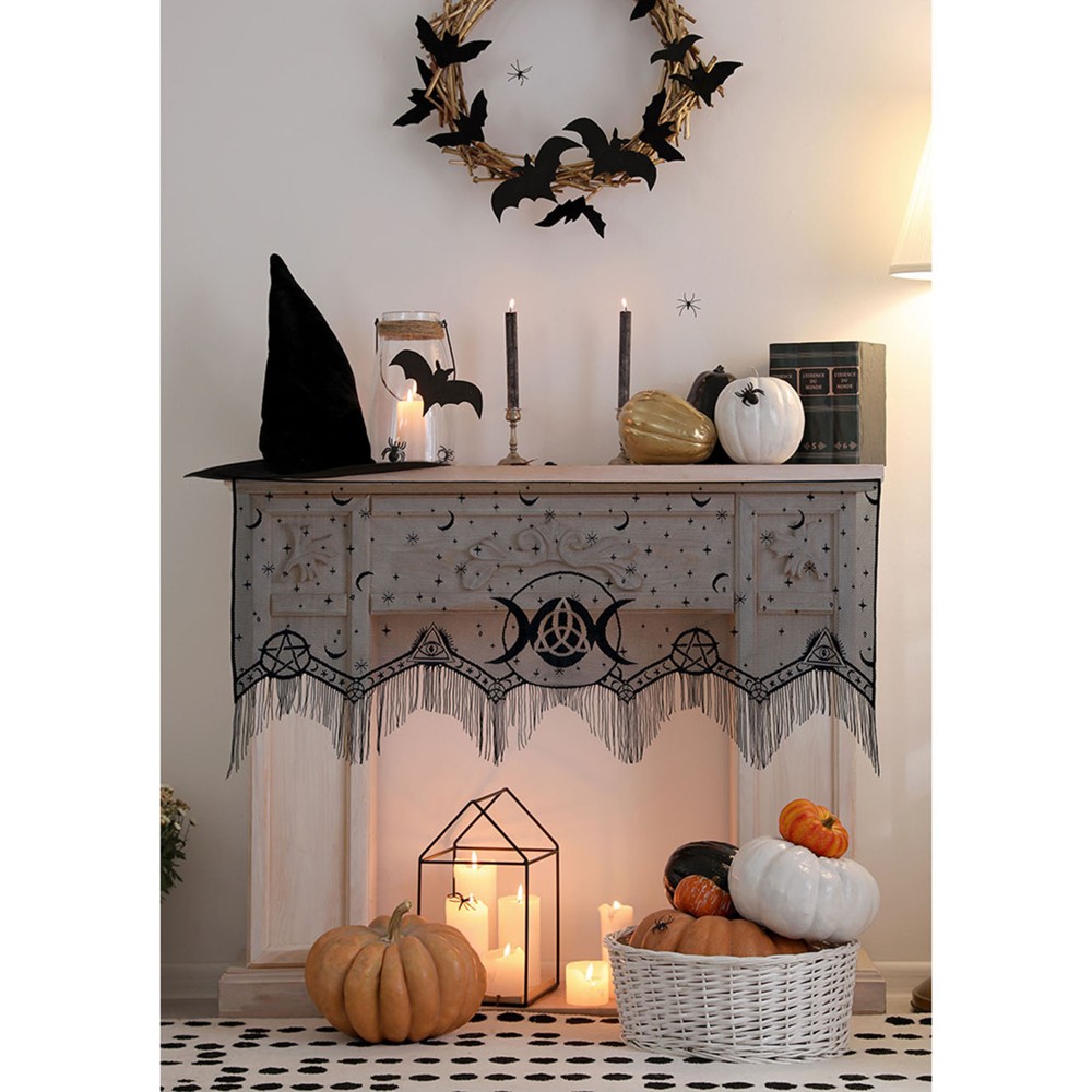 Perde dekorimi me fije në përmasë 155x60 cm. Kjo perde dekorimi prej aterial poliester është 60 cm e lartë. E përkryer për dekorimin e një oxhaku gjatë festës së halloween.