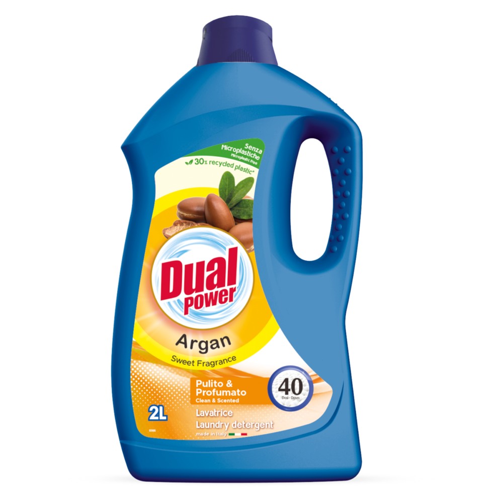 Detergjent likuid, Dual, për rroba të bardha dhe me ngjyra. Formula e tij e fuqishme e enzimës dhe veprimi i heqjes së yndyrës largojnë njollat më të vështira, ndërkohë që janë të butë me pëlhurat dhe ngjyrat. Punon edhe në temperatura të ulëta. I lë rrobat të buta dhe me aromë të këndshme me një aromë të freskët.