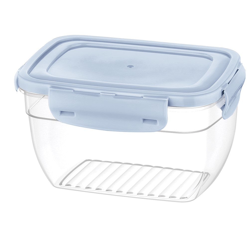 Kjo enë ushqimi është bërë prej plastike me cilësi të lartë. Me ngjyrë transparente, dhe me kapak silikoni me ngjyrë blu/blu e hapur siguron mbyllje hermetike dhe parandalon rrjedhjet e mundshme. Ngjyra e saj transparente lejon një pamje të shpejtë të përmbajtjes, gjë që e bën të lehtë gjetjen e asaj që na nevojitet. Një kapak i sheshtë, i profilizuar ju lejon të vendosni kontejnerë njëri mbi tjetrin, gjë që kursen hapësirë të vlefshme. Ena është e përshtatshme për të ruajtur lloje të ndryshme të ushqimit si në frigorifer ashtu edhe në ngrirje. Do të funksionojë mirë edhe në qilar, dollap ose në banak të kuzhinës. Mund ta përdorni në një furrë me mikrovalë për të ngrohur ushqimin e gatuar më parë (pa kapak).