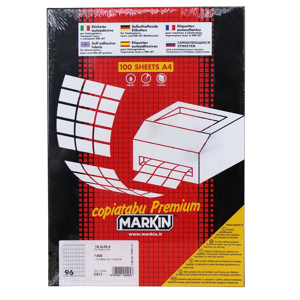 Etiketa ngjitëse 16.3x35.6 mm, pa diferencë. E pershtatshme për fotokopje, printer lazer etj. Format A4, 100 fletë për paketim, 96 etiketat për fletë me ngjitjes të përhershëm.