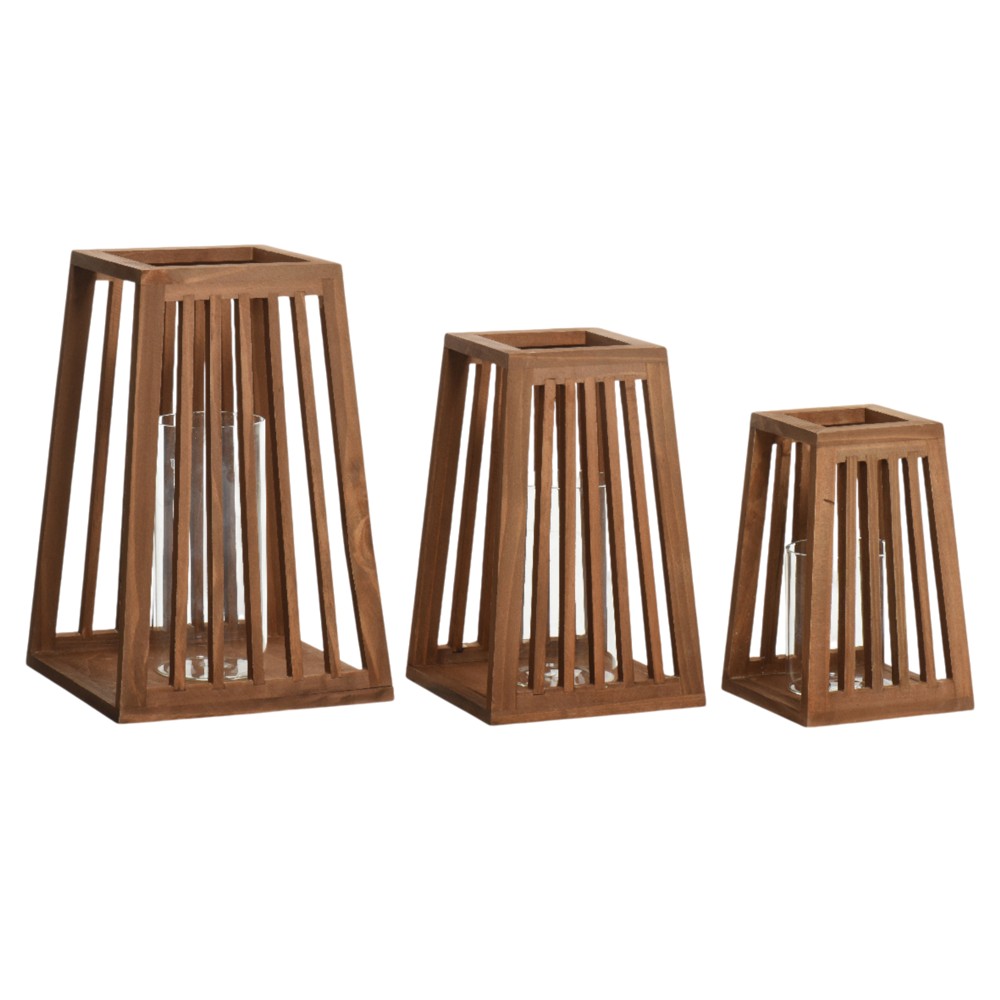 Fener dekorativ, set 3 copë, druri, kafe, L:20x20xH30cm, M:16x16xH25cm, S:13x13xH20cm