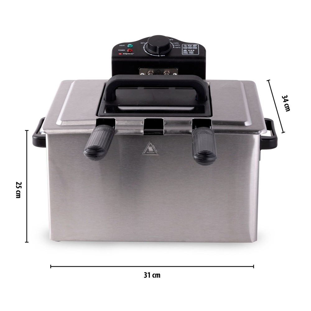 Me këtë fritezë të thellë të dyfishtë nga Alpina ju mund të skuqni shpejt patate të skuqura dhe/ose ushqime për të gjithë familjen. Friteza e thellë ka 3 kosha për skuqje, 1 i madh dhe 2 më i vogël, kështu që mund të skuqni të gjitha llojet e të ushqimeve në të njëjtën kohë. Në këtë mënyrë ju mund të zgjidhni një fritezë e vetme apo e dyfishtë. Dhe kjo është shumë e dobishme kur ka darkues të uritur që presin në tryezë. Në këtë mënyrë ju mund të shërbeni një pjatë të madhe me patate të skuqura ose një kombinim të snacks dhe patate të skuqura në të njëjtën kohë. Skuqja me këtë fritezë të thellë është shumë e lehtë. Përveç termostatit të rregullueshëm që shkon deri në 190 °C, do të gjeni një udhëzues me ushqime të ndryshme dhe temperaturat e tyre të skuqjes. Ju zgjidhni temperaturën e duhur dhe kur drita treguese fiket, ulni koshin(et) e skuqjes me ushqim në vajin e nxehtë. Friteza ka një kapacitet jo më pak se 5 litra dhe një fuqi prej 2000 Watts. Struktura është prej çeliku inox dhe shportat e skuqjes janë gjithashtu prej çeliku inox të qëndrueshëm. Falë tavës së brendshme të lëvizshme dhe elementit elektrik të lëvizshëm, fërtesa e thellë pastrohet lehtë.