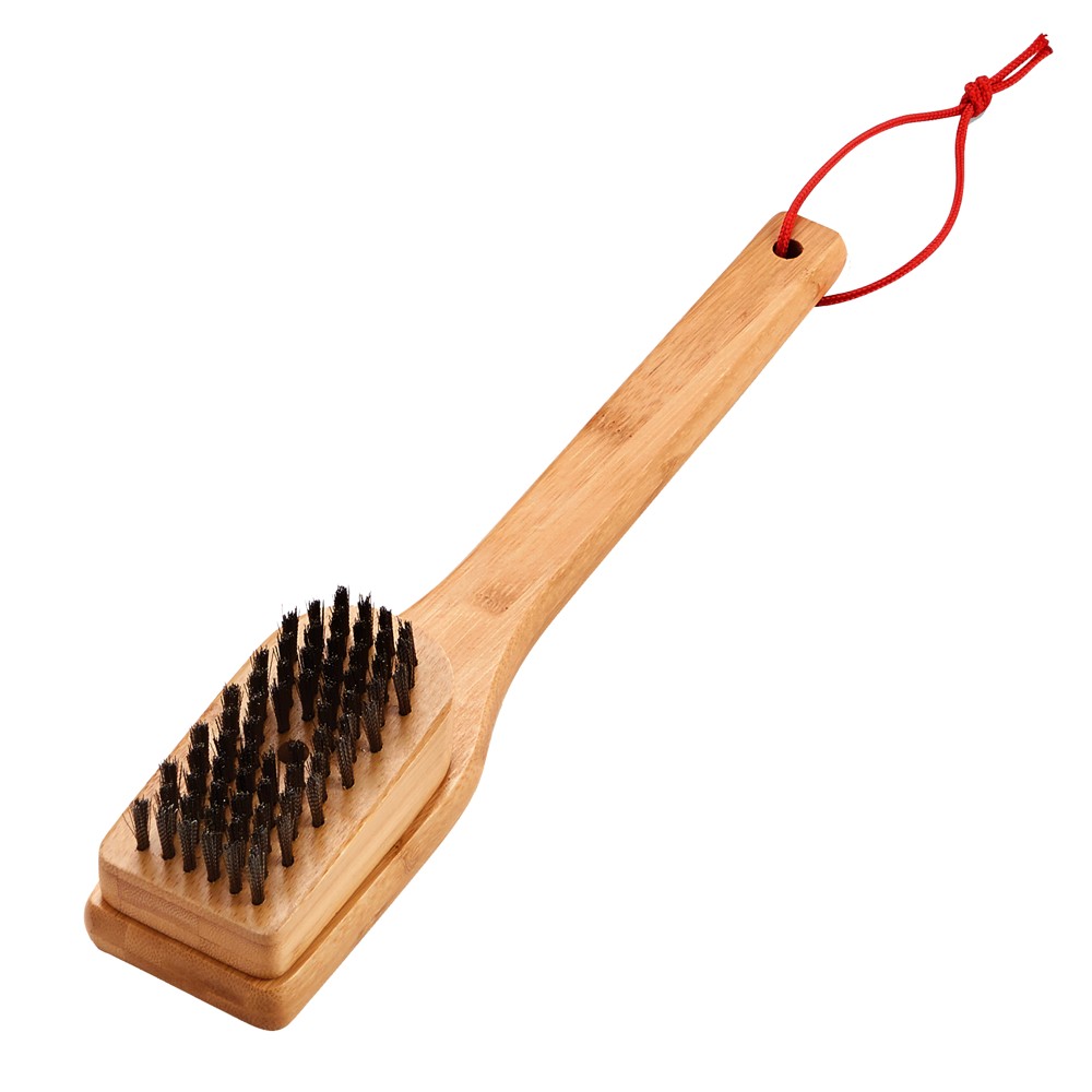 Furça Bamboo Grill Brush është projektuar për të hequr lehtësisht dhe në mënyrë efektive grimcat e ushqimit, yndyrat dhe mbeturinat nga grilat e të gjitha madhësive. Koka me qime me kënd ju lejon të hiqni ushqimin e mbërthyer pa iu afruar shumë nxehtësisë. 30 cm e gjatë për të arritur të gjitha zonat e skarës. Unazë për varjen dhe ruajtjen e lehtë të furçës.