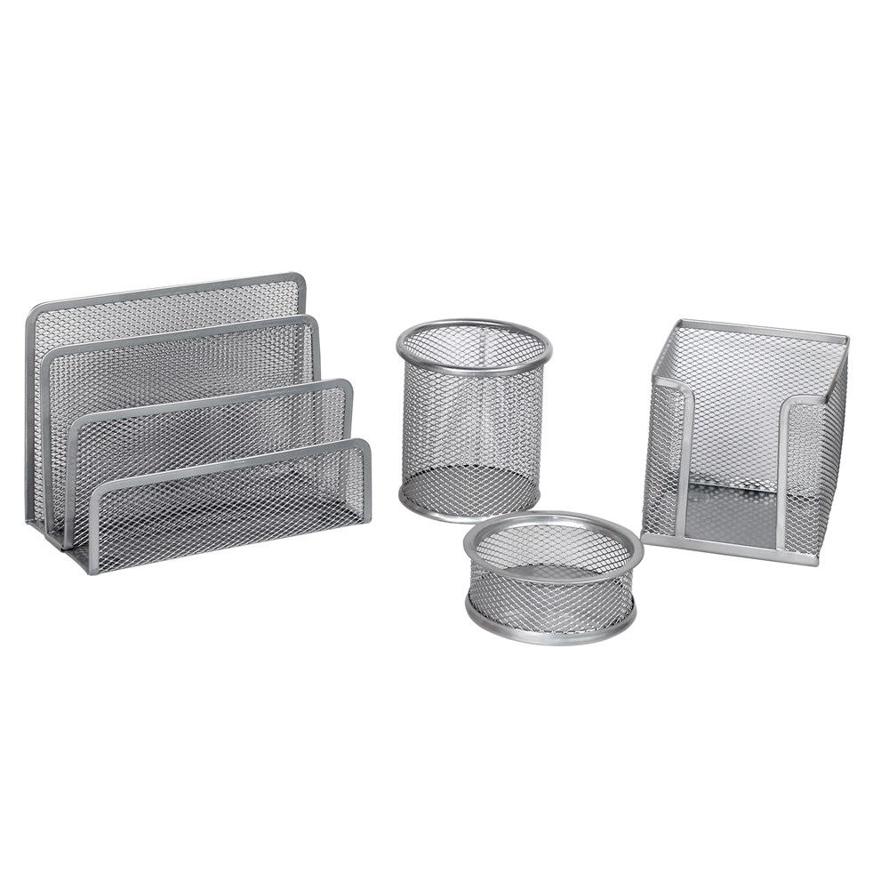 Në këtë set përfshihen një gotë cilindrike për vendosjen e lapsave, një gotë e vogël për vendosjen e kapëseve të fletave, një mbajtëse letrash dhe një mbajtëse shënimesh. Të gjithë këto elemente kanë një formë të bukur dhe moderne dhe janë shumë të dobishme për organizimin e tryezës së punës në zyrë, shkollë apo shtëpi.