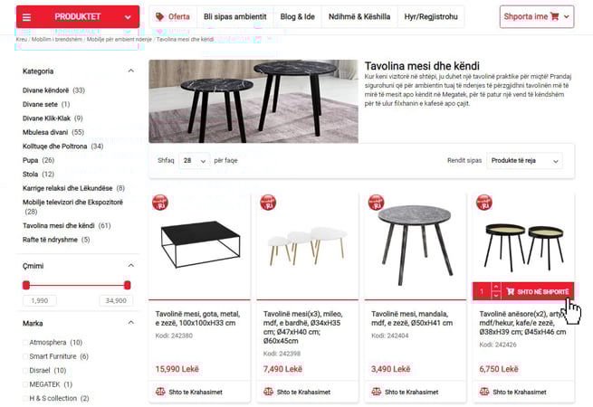 Duke hyrë në www.megateksa.com zgjidhni produktin/produktet që dëshironi të porosisni duke shtuar në shportë secilin prej tyre. Mund të shtoni direkt produktin në shportë siç tregohet tek fotoja e parë, ose mund të klikoni mbi produkt duke parë më me detaje specifikat e produktit dhe ta shtoni në shportë (Foto 2). Keni mundësi që të zgjidhni edhe sasinë që dëshironi duke klikuar shenjën + që ndodhet pranë butonit “Shto në shportë”.