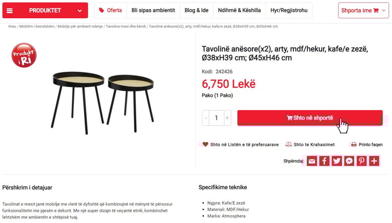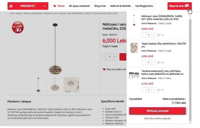 Pasi keni shtuar në shportë produktet që dëshironi, Klikoni tek butoni “Shporta ime” dhe do ju shfaqen dy mundësi: “Përfundo porosinë” dhe “Shiko dhe modifiko shportën”