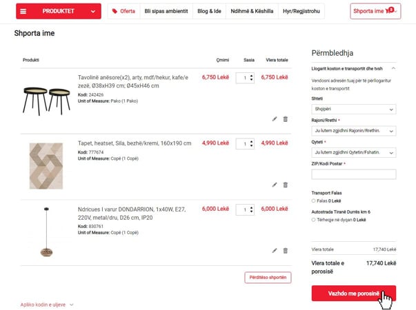 Do ju shfaqet faqja si më poshtë me produktet që keni shtuar në shportë dhe me vlerën e tyre përkatëse. Pasi të keni bërë ndryshime në sasinë e produkteve, mos harroni të klikoni “Përditëso shportën”, në mënyrë që të ruhen ndryshimet. Klikoni “Vazhdo me porosinë”.