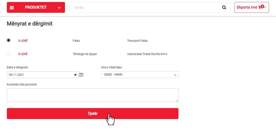 Duke qëndruar në të njëjtën faqe, vazhdoni plotësimin për “Mënyrat e dërgimit”, duke zgjedhur Transportin ose Tërheqjen në dyqan. Keni mundësi të zgjidhni edhe datën dhe orën kur dëshironi të mbërrijë porosia në adresën tuaj. Për çdo koment mbi porosinë mund të shënoni në fushën që shfaqet si më poshtë. Pasi keni përfunduar, kliko “Tjetër” për të vazhduar me hapin e rradhës.