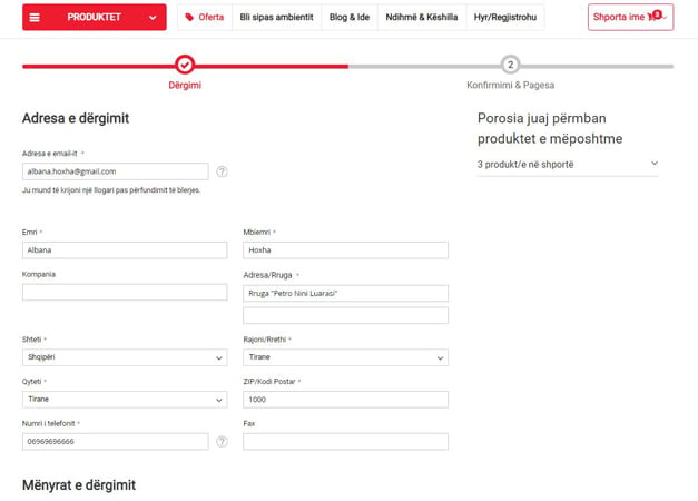 Pasi të keni klikuar “Vazhdo me porosinë” do ju shfaqen fushat që duhet të plotësoni për adresën e dërgimit të porosisë.
