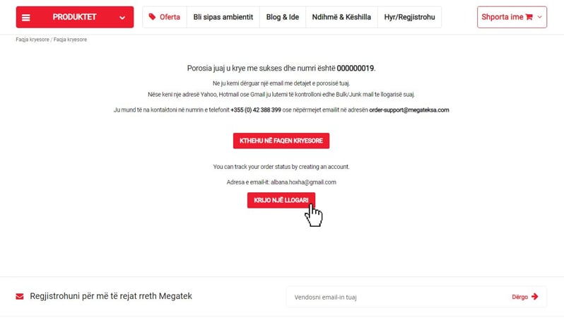 Në emailin që keni plotësuar tek Adresa e Dërgimit, ju do të merrni numrin e porosisë suaj si dhe detajet përkatëse të porosisë që kryet. Në mënyrë që porosinë tuaj të rradhës ta kryeni më shpejt dhe më lehtë, klikoni “Krijo një llogari”.