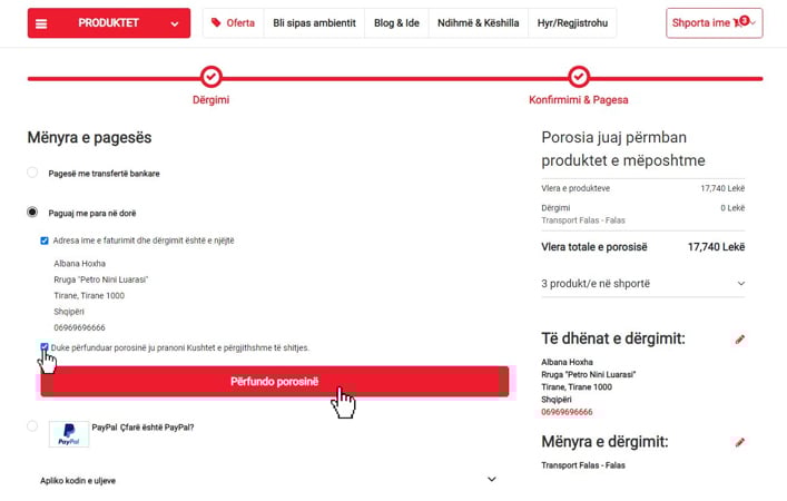 Keni mundësi të zgjidhni midis mënyrave të ndryshme të pagesës. Pasi keni zgjedhur një prej tyre, mos harroni të klikoni kutinë tek fjalia “ Duke përfunduar porosinë ju pranoni Kushtet e përgjithshme të shitjes”. Për çdo ndryshim që dëshironi të bëni për “Të dhënat e dërgimit” ose “Mënyra e dërgimit”, mjafton të klikoni tek shenja e lapsit. Ky është hapi i fundit, ku duke klikuar “Përfundo porosinë”, ju realizoni me sukses porosinë tuaj.