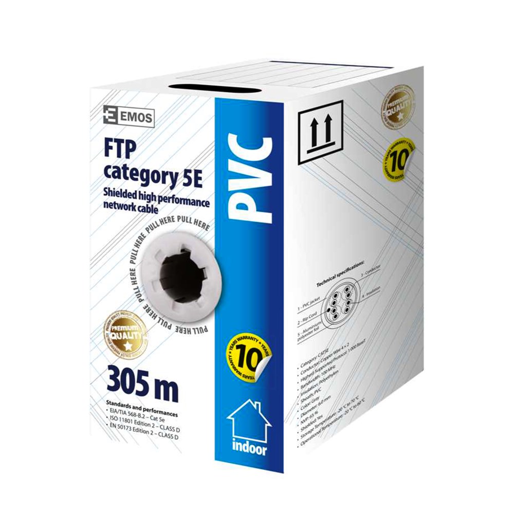 Kabllëll rrjeti FTP e cilësisë më të lartë, kategoria CAT5E me izolim PVC. Telat e përcjellësit janë të përbërë nga materiali I bakrit jo i ricikluar.