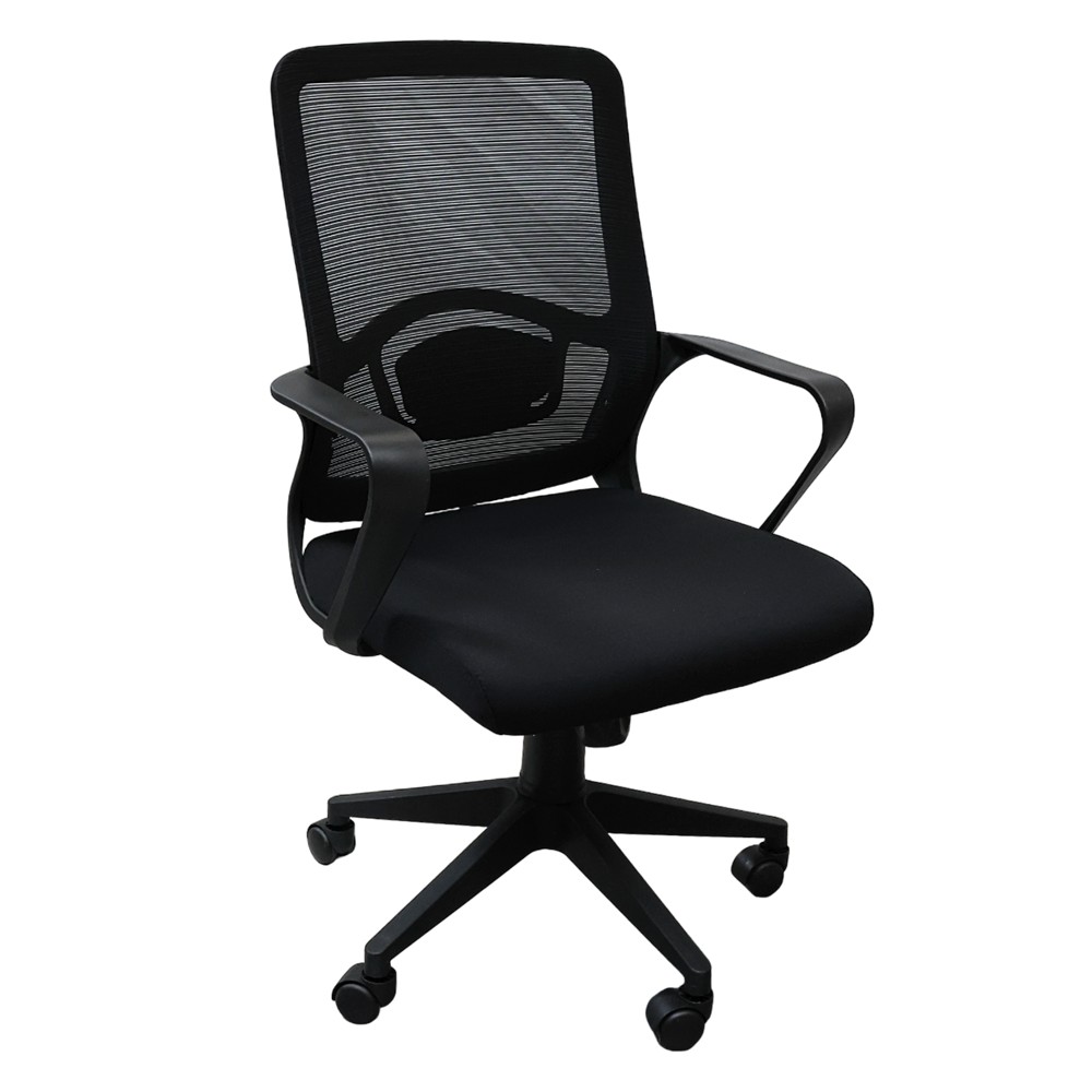Karrige zyre, mbështetëse rrjetëzuar, ulëse veshje tekstili, krahë PP, këmbë dhe rrota najloni, e zezë, 58x60xH93-103 cm