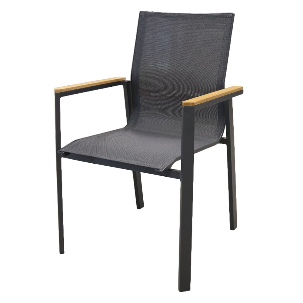 Ndertuar nga strukture solide prej Alumini dhe lyer me ane te procesit "elektrostatik" te lyerjes. Bazamenti dhe pjesa mbeshtetese perbeht prej tekstili rezistent. Perberja kimike e ben ate te qendrueshem ndaj degradimit UV dhe agjenteve atmosferik. Densiteti i larte i copes, mund te perballoje peshe deri ne 120 kg. Karrigja ofron komoditet gjate perdorimit. Mbeshtetesit e kraheve fale formes se drejte dhe siperfaqes se lemuar krijojne rehati. Avantsazhi i te qenurit e stivueshme, e ben edhe me te lehte magazinimin, pasi karriget mund te vendosen njera mbi tjetren. Dizajni i qarte dhe linjat e drejta te struktures, te kombinuara me formen e pjerret te tekstilit, demonstrojne stil dhe klas.