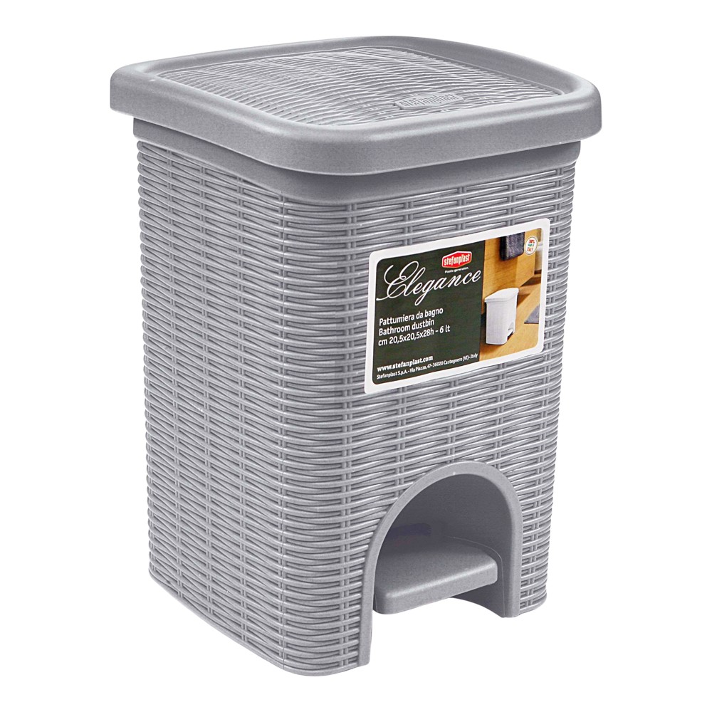 Koshi i mbeturinave "Elegance" nga Stefanplast prodhuar ne polipropilen të cilësisë së lartë është ideal për magazinimin e mbetjeve në shtëpinë tuaj. Në formë katrore dhe kapacitet prej 6 litrash është mëse i mjaftueshëm për çdo lloj ambjenti. Ngjyra gri neutrale përshtatet lehtësisht me të gjithë tipet e ambjenteve. Hapja me pedal e bën këtë kosh tepër praktik. Përmasat : lartësia 28 cm cm x gjerësia 20.5 cm x thellësia 20.5 cm.