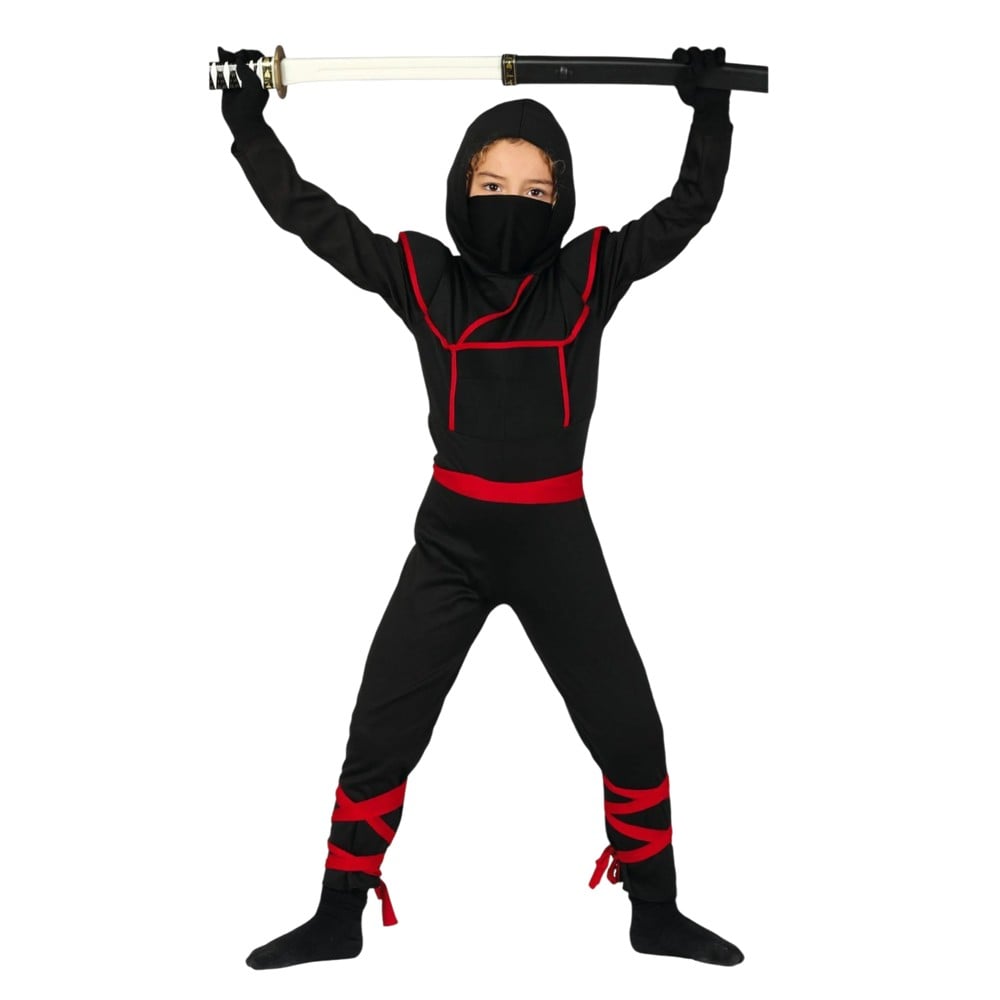 Kostum Ninja për fëmijë, prej materiali poliestre, në ngjyrë mikse. Materiali përbërës është i butë në prekje dhe nuk shkakton irritim në lëkurë. Ky produkt është i përshtatshëm për përdorim nga fëmijë të moshës 7-9 vjec me gjatësi 125 cm deri në 135 cm, bust 67-70 cm, beli 59-60 cm, ijet 67-72 cm.