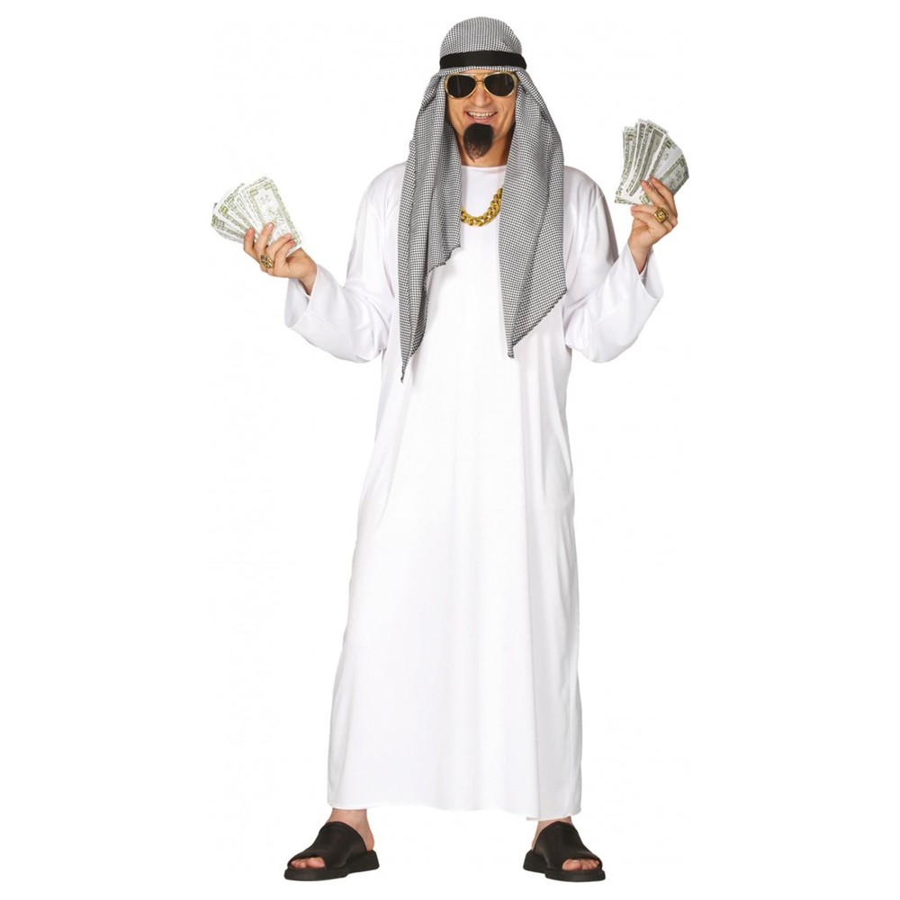 Kostum Sheikh për të rritur, prej materiali poliestre, në ngjyrë të bardhë, masa 52/54. Materiali përbërës është i butë në prekje dhe nuk shkakton irritim në lëkurë. Ky produkt është i përshtatshëm për përdorim në festa si Halloween, karnavale apo festa të tjera me kostume.