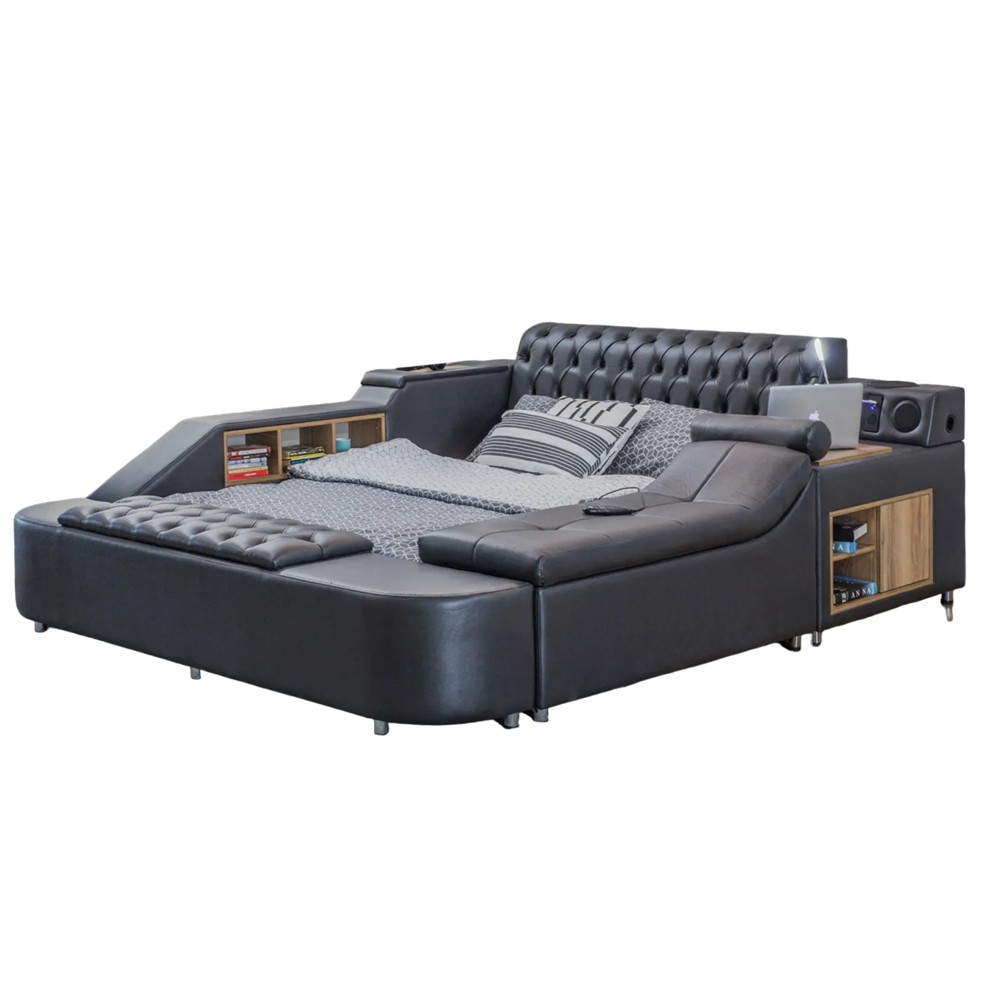 Krevat multifunksional Dorwell, me përmasa 240x290x100 cm, me veshje poliuretani, në ngjyrë të zezë. Struktura mbajtëse është e përbërë nga material rezistent melamine, e pajisur me këmbë statike metalike. Krevati ka sipërfaqe fjetjeje prej 160x220 cm dhe është i pajisur me ndenjëse masazhuese në njërën anë me pjesë mbështetëse për shpinën në kënd 45°. Në pjesën e jashtme ka një raft druri me 3 ndarje dhe një kasafortë për ruajtjen e sendeve të vlefshme. Krevati është i pajisur me tavolinë anësore me lartësi të rregullueshme për vendosjen e laptopit, me ndriçues leximi LED dhe bokse me Bluetooth me portë karikimi USB. Në anën tjetër, krevati është i pajisur me një raft librash me 3 ndarje dhe një tavolinë të vogël anësore, e cila hapet duke ofruar një hapësirë praktike magazinimi. Krevati ka një mbështetëse të lartë për shpinën dhe një stol në pjesën fundore të tij, i cili ka mbushje të butë sfungjeri. Pjesa e sipërme e stolit mund të hapet, duke ofruar një hapësirë tjetër magazinimi me dy ndarje për vendosjen e rrobave apo tekstileve të tjera. Veshja e jashtme prej materiali poliuretani nuk mban pluhur, është rezistente ndaj ujit dhe njollave dhe mund të pastrohet lehtësisht me një pecetë të lagur. Dizajni modern me veshje lëkure artificiale dhe prakticiteti që ofron e bëjnë këtë krevat një zgjedhje të sofistikuar dhe luksoze për ambientet e dhomave të gjumit.