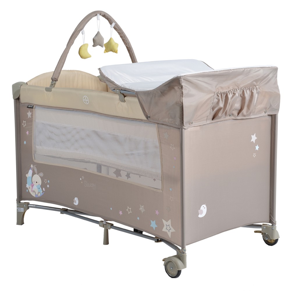Krevat portativ me dy nivele, me strukturë mbajtëse të përbërë nga material alumin dhe plastik të qëndrueshëm dhe veshje prej materiali poliestre antialergjike dhe antibakteriale. Krevati ka një hapje anësore me zinxhir, sistem të palosjes, një lojë me avrje, dhe një çantë mbajtëse. Mund të përdoret si krevat për fëmijë, si kënd lojërash dhe si krevat portativ lehtësisht i palosshëm dhe kompakt për t'u marrë me vete në udhëtime. Ky produkt është i përshtatshëm për fëmijë të moshës 6 - 36 muajsh, me peshë deri në 15 kg.