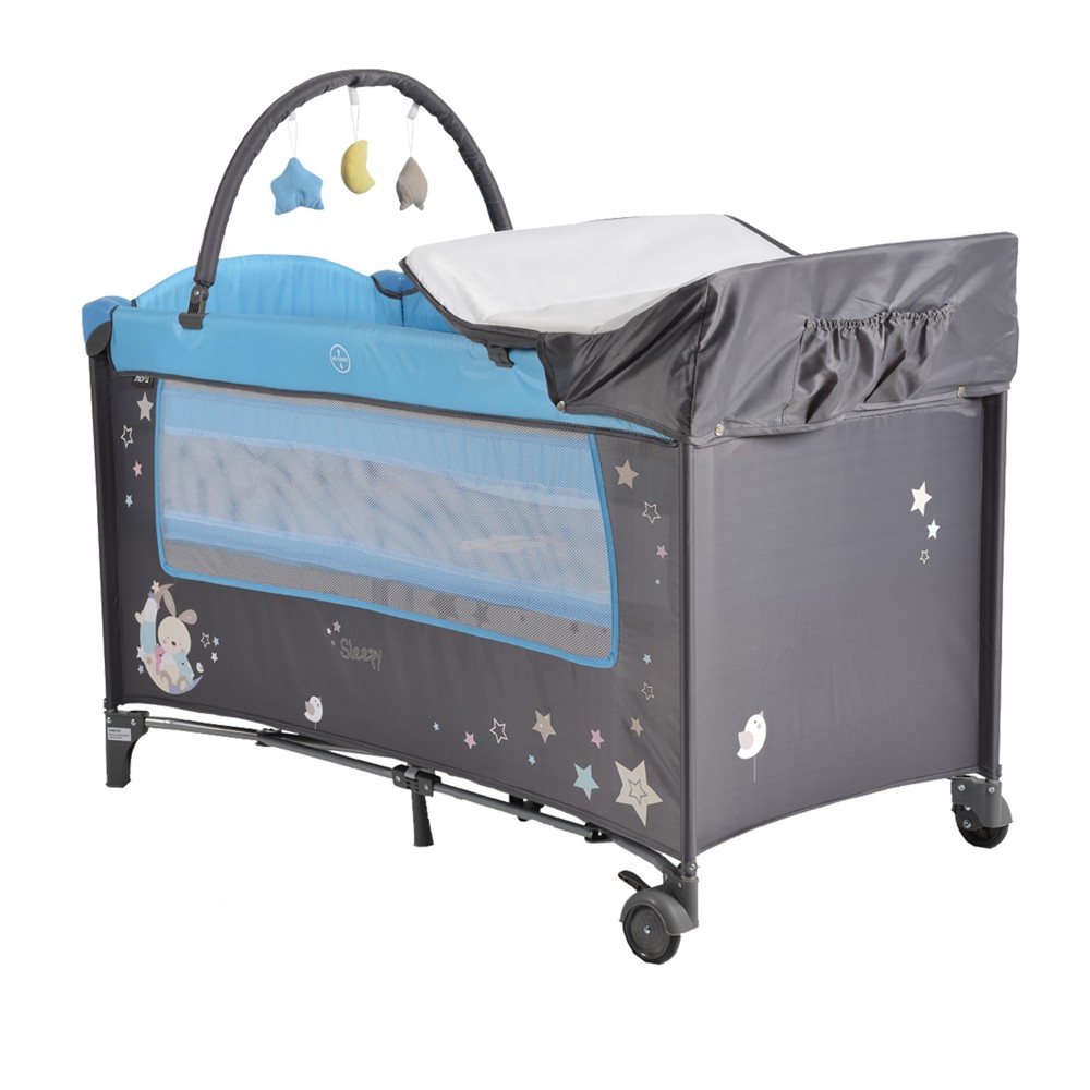 Krevat portativ me dy nivele, me strukturë mbajtëse të përbërë nga material alumin dhe plastik të qëndrueshëm dhe veshje prej materiali poliestre antialergjike dhe antibakteriale. Krevati ka një hapje anësore me zinxhir, sistem të palosjes, një lojë me avrje, dhe një çantë mbajtëse. Mund të përdoret si krevat për fëmijë, si kënd lojërash dhe si krevat portativ lehtësisht i palosshëm dhe kompakt për t'u marrë me vete në udhëtime. Ky produkt është i përshtatshëm për fëmijë të moshës 6 - 36 muajsh, me peshë deri në 15 kg.