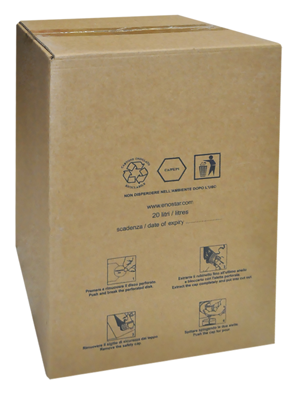 Kuti ambalazhimi kartoni 20 litra për qesen e aluminit të verës. Përdoret me qesen e aluminit, të cilat, pasi mbushen me verë, vendosen brenda kutisë së kartonit për mbrojtjen ndaj goditjeve.